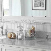 Ванная преобразится до неузнаваемости, если декорировать зеркало морскими ракушками. Для создания фона композиции, выполненной в морском стиле, используйте золотую или бирюзовую акриловую краску.